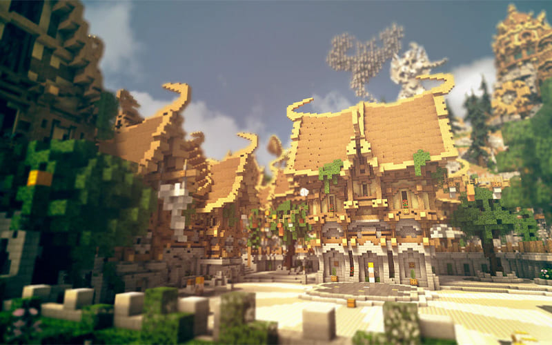 Edificios temáticos: En lugar de una sola base, dale a cada actividad su propio edificio temático. Por ejemplo, una torre para encantar o una bóveda para objetos valiosos. Así, tu asentamiento se verá más como una ciudad o aldea cohesiva.