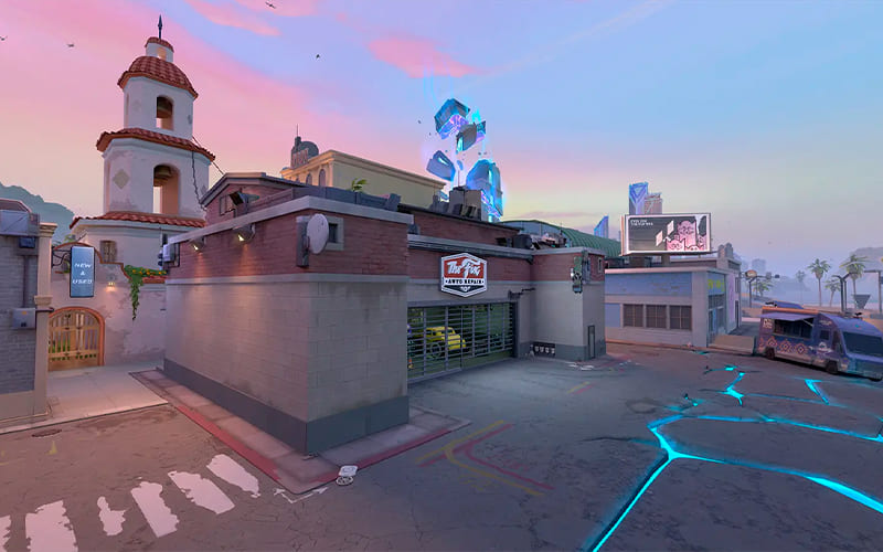 El centro de Sunset es una posición muy importante en el mapa. Las indicaciones en el centro de Sunset del mapa de Valorant son sencillas: