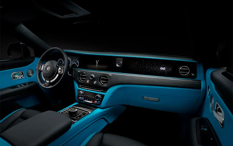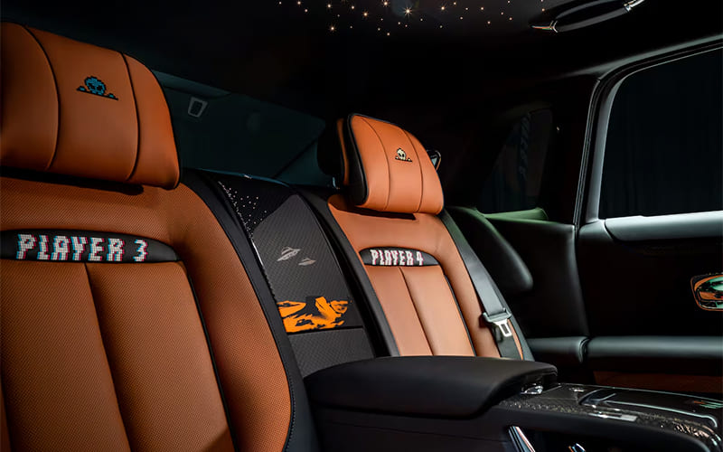 El Black Badge Ghost Gamer luce un techo interior “Pixel Blaster” con efecto de luz estelar. Una formación de 80 naves de batalla pixeladas cubre el techo, cada una iluminada con fibra óptica colocada a mano. La función Shooting Star, sello distintivo de la marca, se ha reprogramado para simular disparos láser, y haces de luz pulsan desde las naves a través del techo, añadiendo un toque nostálgico y dramático al cielo nocturno.