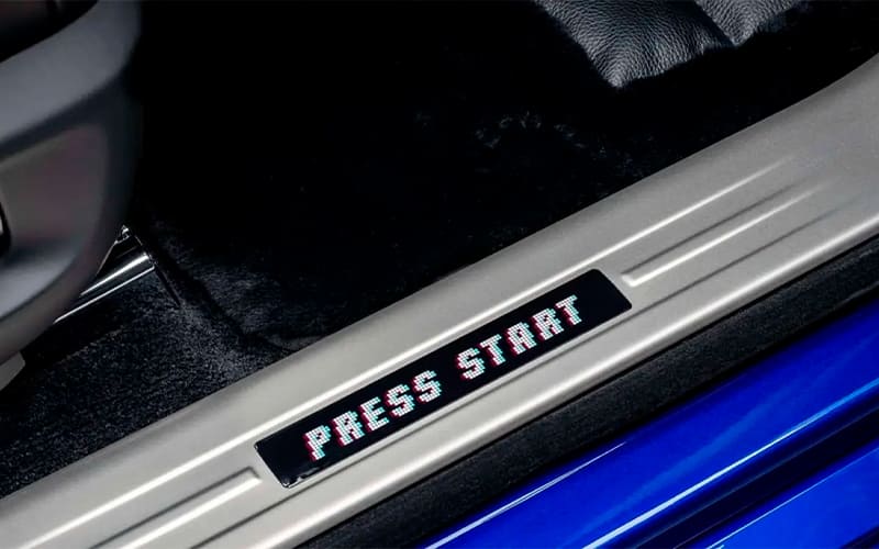 El encargo se completa con estribos iluminados personalizados, visibles al abrir las puertas. Grabados con la misma tipografía gráfica de 8 bits que el bordado de los asientos, muestran mensajes clásicos de videojuegos arcade: “Pulse Start”, “Cargando..”, “Suba de nivel” e “Inserte moneda”.